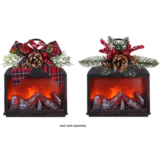 9″ Christmas Time Flameless Fireplace Lantern With Pinecone And Red Berries