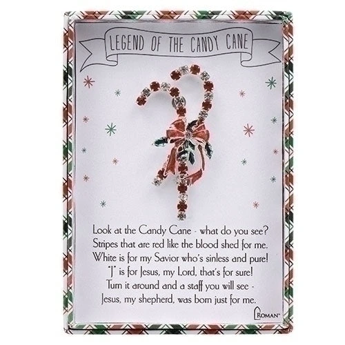 This beautiful brooch in red, silver and green color combination is adorned with rhinestones. It is a beautiful gift with a beautiful sentiment: “Look at the Candy Cane… what do you see? Stripes that are red like the blood shed for me. White is for my Savior who’s sinless and pure! “J” is for Jesus, my Lord, that’s for sure! Turn it around and a staff you will see – Jesus, my shepherd, was born just for me.” It reminds us of what Christmas is all about. It is a great hostess gift, or a gift for any believer. Size: 2.5″H 1.33″W