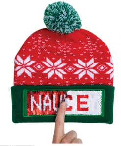 Christmas Naughty Or Nice Changeable Sequin Snowflake Red Pom Beanie Hat