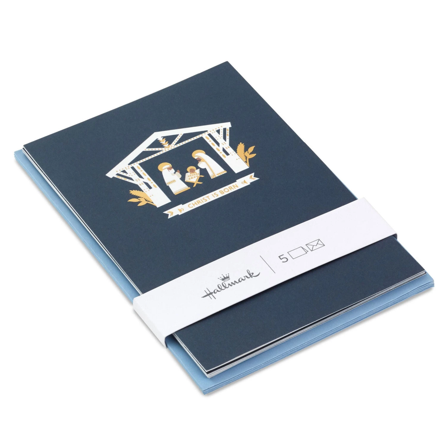 Christmas card pack features a stately illustration of Mary and Joseph with Jesus in a stable, accented with gold foil details on deep blue. Our convenient pick-a-pack sets of five Christmas cards make it easy to mix, match and share happy holiday wishes with all your family and friends.