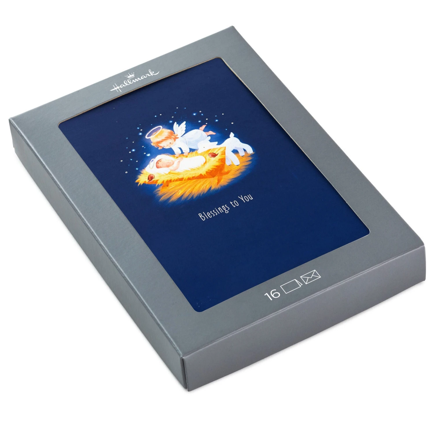 Boxed Christmas cards feature a cute design of a little angel and lamb watching over the baby Jesus in a manger. Silver foil accents add a hint of shine. Multipack of holiday cards is perfect for sending wishes of peace and love to friends and family.