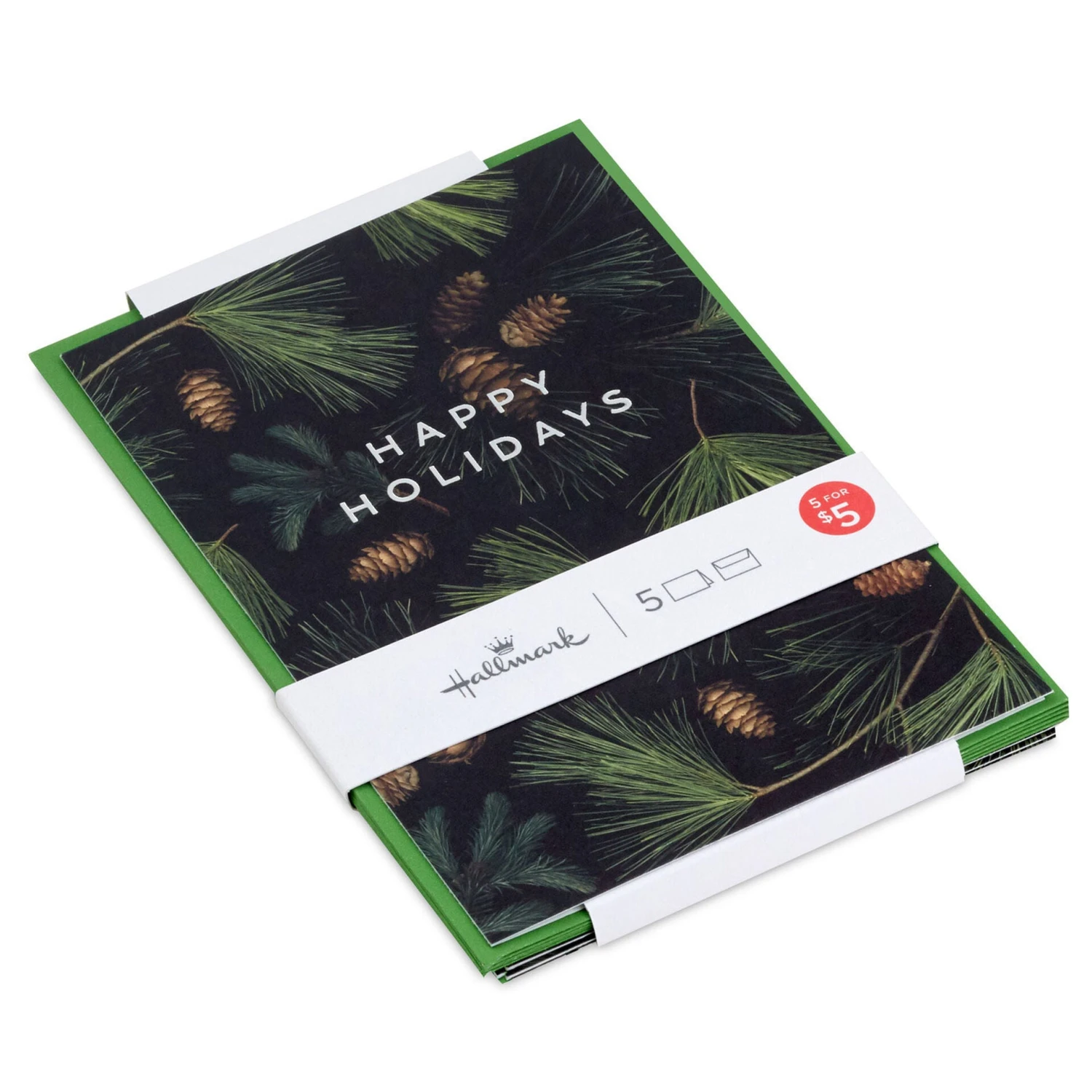 Christmas card pack features a striking image of pine boughs with pinecones that pop on a dark background. Our convenient pick-a-pack sets of five Christmas cards make it easy to mix, match and share happy holiday wishes with all your family and friends.